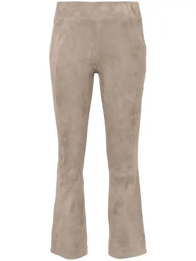 taupe calf suede stretch-design elasticated waistband internal logo tag flared hem cropped leg concealed side zip fastening