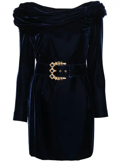 midnight blue silk velvet draped panel detail twist detailing boat neck concealed side zip fastening detachable waist belt off-shoulder long sleeves fitted waistline straight hem thigh-length silk lining Condition: GOOD. This previously owned and used item is in good condition with minimal signs of use. This may include fading of material or plating and scratches.