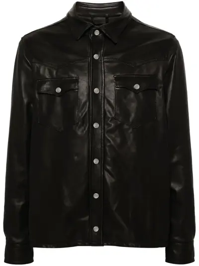 black leather smooth grain classic collar long sleeves press-stud fastening cuffs two chest flap pockets rear curved hem partial lining front press-stud fastening