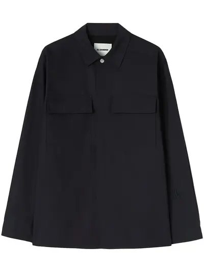 navy blue cotton logo tag classic collar front button fastening long sleeves two chest flap pockets straight hem