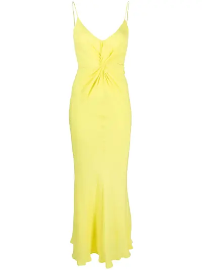 fluorescent yellow chiffon knot detailing V-neck adjustable spaghetti straps sleeveless concealed rear hook and zip fastening scoop back flared full-length full lining