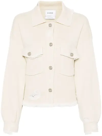 light beige cotton-cashmere blend fringed edge straight-point collar front button fastening drop shoulder long sleeves buttoned cuffs two chest flap pockets