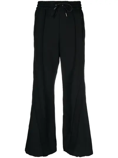black pressed crease seam detailing elasticated drawstring waistband two side zip-fastening pockets two rear welt pockets flared hem