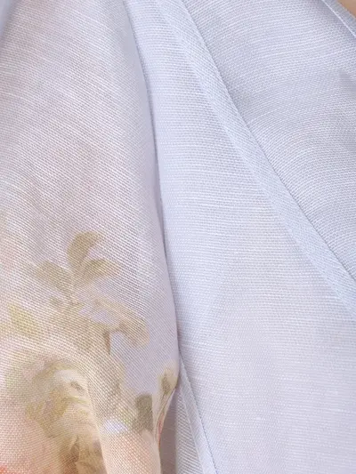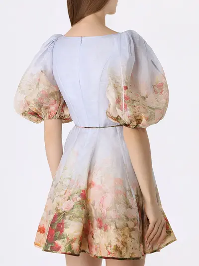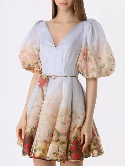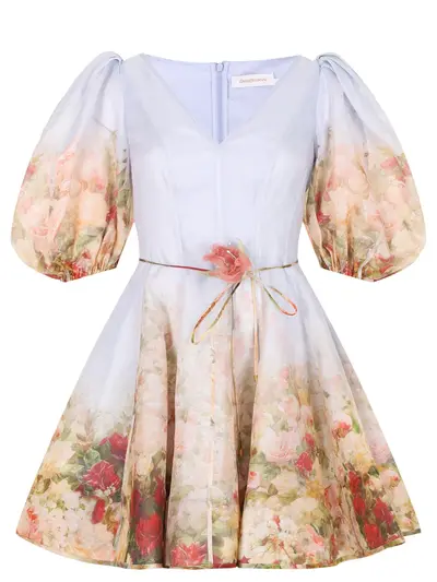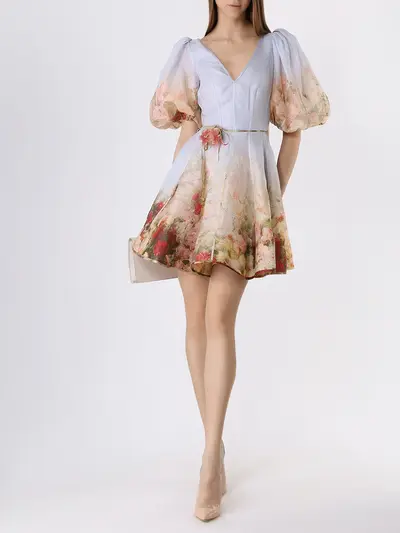 -Голубое мини-платье купажированного состава с цветочным принтом от ZIMMERMANN.