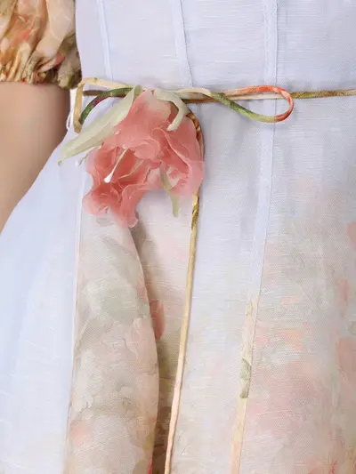 -Модель с акцентом кроя на талии, которую дополнительно подчеркивает узкий пояс с цветочным бутоном, короткими объемными рукавами, V-образным вырезом на груди, застежкой на потайную молнию сзади.