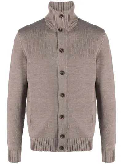 taupe brown merino wool ribbed knit high neck ribbed cuffs and hem two side welt pockets front button fastening