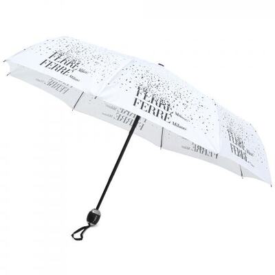 Зонт от Ferre Milano. Белый зонт с фирменным принтом - универсальной аксессуар, который подойдет к любому образу и ситуации. У зонта комбинированная ручка из пластика и металла с кнопками управления, дополненная удобной петлёй на запястье. В сложенном виде зонт застёгивается на кнопку. В комплекте чехол в цвет. В сложенном виде зонт занимает совсем немного места благодаря компактным размерам - всего 28 см.