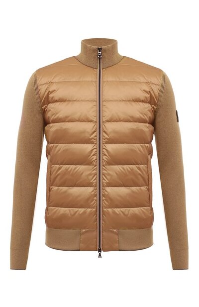 Для создания кардигана использовали разные по фактуре материалы. Модель связали из мягкой шерсти с добавлением мягкого хлопка и вискозы, а для стеганого переда использовали прочный непромокаемый нейлон. Горизонтальные камеры наполнили отборным утиным пухом, сделав изделие теплее. Куртка с воротником-стойкой и двумя боковыми карманами застегивается встречной молнией с пуллером в виде буквы В.