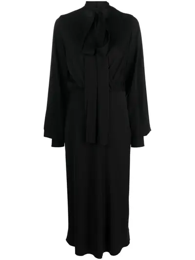 black stretch-silk attached scarf V-neck long sleeves mid-length flared hem
