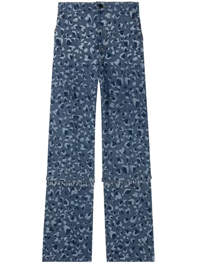 indigo blue organic cotton all-over leopard print frayed detailing embroidered logo to the rear high-waisted front button and zip fastening two diagonal pockets to the sides two rear welt pockets wide leg