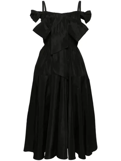 black faille elasticated neckline off-shoulder adjustable shoulder straps keyhole detail to the front tiered bodice oversize bow detail flared skirt calf-length two side slit pockets