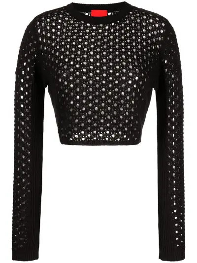 black cotton-cashmere blend crochet knit open knit crew neck long sleeves ribbed cuffs and hem straight hem