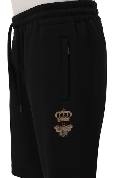Для пошива черных шортов длиной до колена использовали мягкий плотный трикотаж. Материал на основе длинноволокнистого хлопка хорошо пропускает воздух, поэтому в изделии не будет жарко. Доменико Дольче и Стефано Габбана обозначили принадлежность модели марке золотистой вышивкой в виде пчелы и короны на левой брючине.