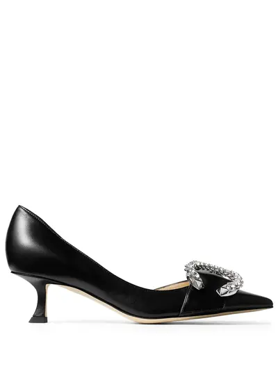 black leather crystal buckle detail pointed toe slip-on style branded leather insole leather sole 50mm kitten heel