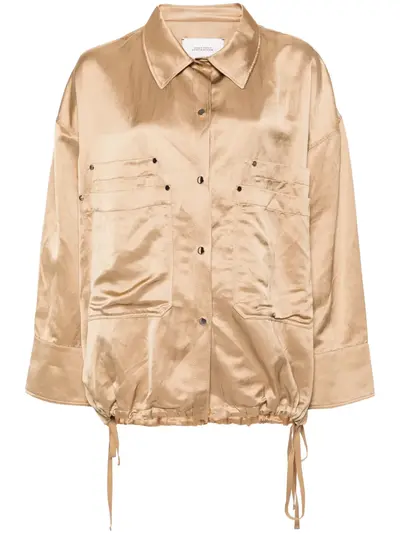 light brown satin weave pointed flat collar drop shoulder long sleeves press-stud fastening cuffs four layered front patch pockets drawstring hem front press-stud fastening