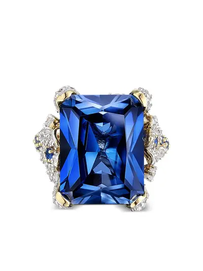 18k yellow gold, white gold and rhodium vermeil polished finish cocktail ring hand-set with laboratory-grown and created gemstones solitaire emerald-cut Kashmir blue sapphire of 18 carats pavé-set Kashmir blue sapphires simulated white diamonds All products are handcrafted. Normal everyday use and external agents may reduce the lustre of gemstones and gold surfaces. To maintain, use specific, non-abrasive products specially meant for cleaning jewellery.