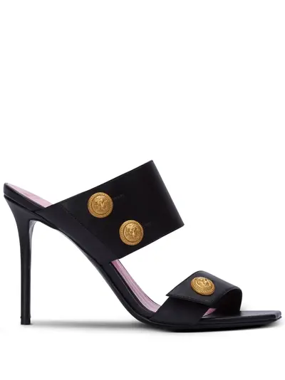 black calf leather stiletto heel branded footbed button-fastening straps logo-embossed buttons lion head motif square open toe gold-tone hardware