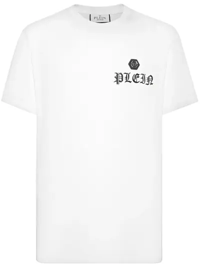 white/black cotton crystal embellishment logo print at the chest skull print to the rear crew neck short sleeves straight hem