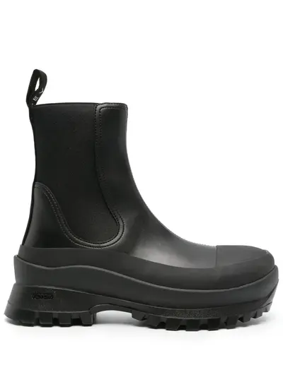jet black faux leather panelled design round toe logo pull-tab at the heel elasticated side panels ankle-length ridged rubber sole