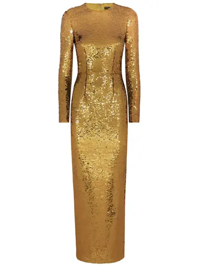 gold-tone sequin design mermaid silhouette round neck concealed rear zip fastening long sleeves rear slit ankle-length straight hem