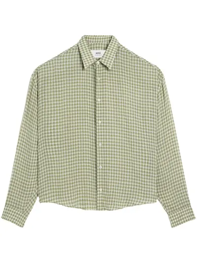 chalk white/olive green gingham check print straight-point collar front button fastening long sleeves buttoned cuffs signature Ami de Coeur monogram motif curved hem When buying this unisex item, keep in mind that it is graded in standard men's sizing.