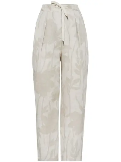 beige linen patterned jacquard high-waisted elasticated drawstring waistband two side slit pockets two rear welt pockets tapered leg