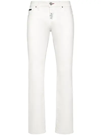 white stretch-cotton denim logo plaque appliqué logo low-rise concealed fly and button fastening classic five pockets straight leg
