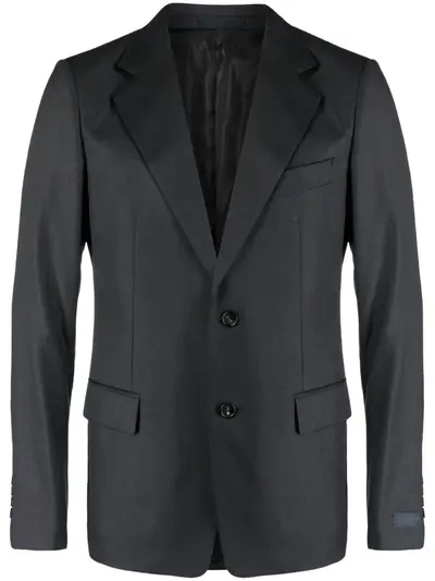 charcoal grey virgin wool central rear vent buttoned-cuff sleeves notched lapels front button fastening chest welt pocket two front flap pockets long sleeves straight hem