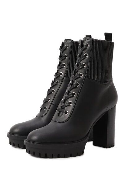 Джанвито Росси создает обувь Martis на устойчивом каблуке разной высоты. У этих черных ботильонов, дополненных широкой протекторной платформой, он самый высокий. Модель с характерной для обуви из этой линии эластичной гофрированной отделкой на голенище сшили из мягкой телячьей кожи. Часть работы итальянские мастера сделали вручную.