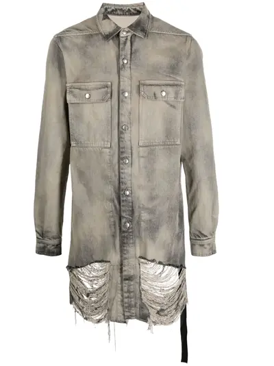 grey cotton distressed effect frayed detailing spread collar long sleeves front flap pockets front button fastening buttoned cuffs asymmetric hem