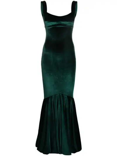 dark green velour bodycon design square neck scoop back sleeveless rear zip fastening peplum hem floor-length