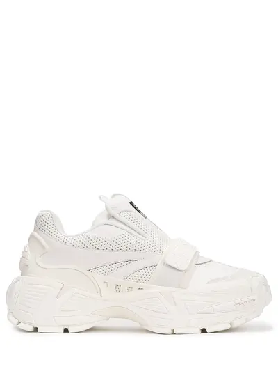 -Белые кроссовки из перфорированной кожи с отделкой текстилем от OFF-WHITE. -Модель с округлым мысом, ремешком-велькро на липучке, блочной подошвой со сложным детализированным литьем, эластичными вставками по бокам для удобства.