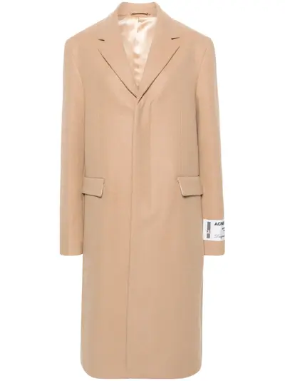 light brown wool blend dart detailing vertical seamed logo patch at the sleeve notched lapels concealed front fastening long sleeves buttoned cuffs two front flap pockets central rear vent straight hem mid-length