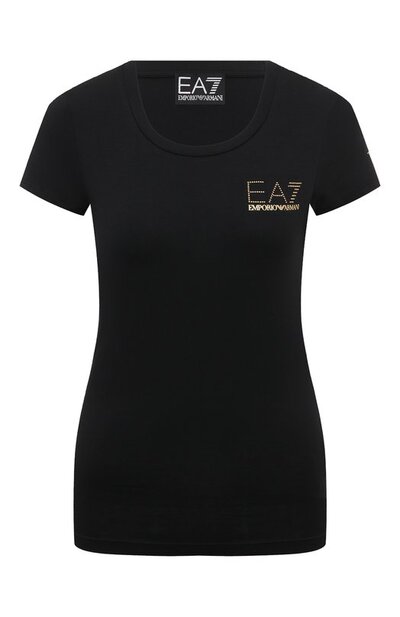 Черная футболка могла выглядеть просто, если бы не золотистая миниатюрная эмблема спереди и на одном рукаве. Для пошива модели мастера марки, основанной Джорджо Армани, использовали тонкое хлопковое джерси с добавлением гладкого модала, который делает материал легким и шелковистым на ощупь.