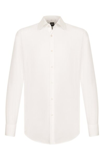 Приталенная белая сорочка с воротником кент – идеальный вариант как для строгого офисного образа, так и для менее формального комплекта. Для ее пошива мастера марки, основанной Хуго Фердинандом Боссом, использовали тонкий легкий поплин из шелковистого хлопка. Модель из такого материала с добавлением стрейчевых волокон комфортно садится по фигуре и почти не мнется, сохраняя безупречный вид в течение дня.