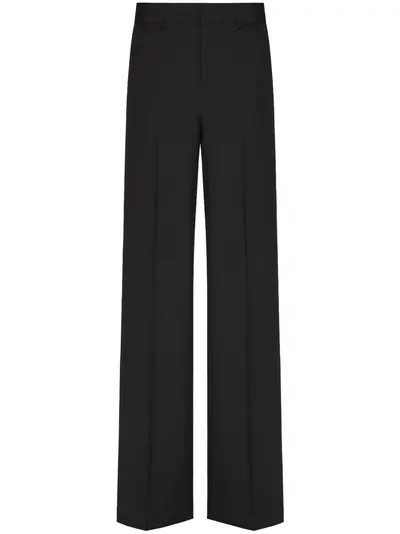 Valentino Ready To Wear black wool mid-rise waist concealed front fastening belt loops two side slash pockets pressed creases two rear welt pockets straight legs The full look includes Valentino Garavani accessories.
