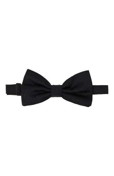 Для пошива темно-синего галстука-бабочки pre-tied использовали фактурный плотный шелк, который хорошо держит заданную форму, сохраняя объем аксессуара. Из такого же материала в тон выполнили узкий ремешок, который можно регулировать миниатюрным слайдером.