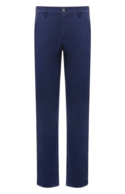 Лаконичные брюки темно-синего цвета напоминают джинсы не только кроем, но и материалом. Для пошива модели с классической посадкой использовали плотный фактурный хлопок стрейч, который хорошо держит форму и пропускает воздух. Изделие с четырьмя карманами украшено брендированным кожаным патчем сзади на поясе.