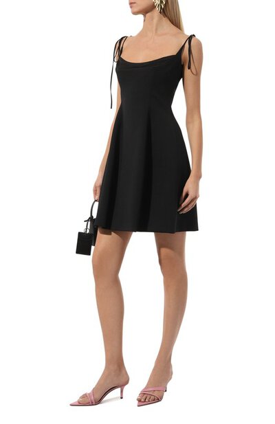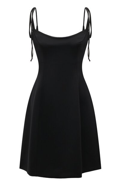 Черное приталенное мини-платье с узкими регулируемыми бретелями, завязывающимися на плечах, и глубокими круглым вырезами с двух сторон сшито из гладкого шелковистого материала стрейч с легким блеском. Лаконичная модель застегивается сзади на потайную молнию с пуллером в виде логотипа марки, основанной Хуго Фердинандом Боссом.