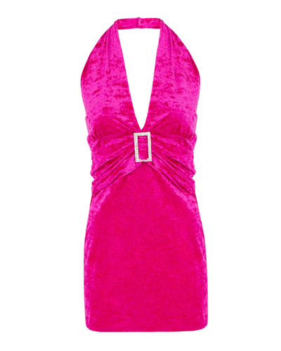Платье P.A.R.O.S.H. сшито из бархатного материала оттенка фуксии. Модель в коктейльном стиле приталенного силуэта с открытой спиной и пряжкой со стразами.