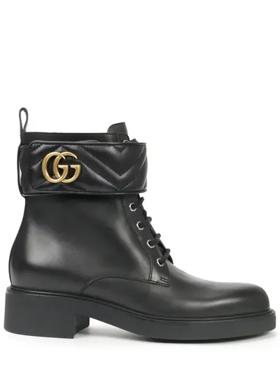 -Черные ботинки из кожи от GUCCI. -Модель с закругленным мысом, толстой резиновой подошвой и низким каблуком, шнуровкой на подъеме, удобной молнией сбоку, петлей на заднике, внутренней отделкой из натуральной кожи. -Голенище дополнено поперечным ремешком с узнаваемым стеганым мотивом и пряжкой GG сбоку.
