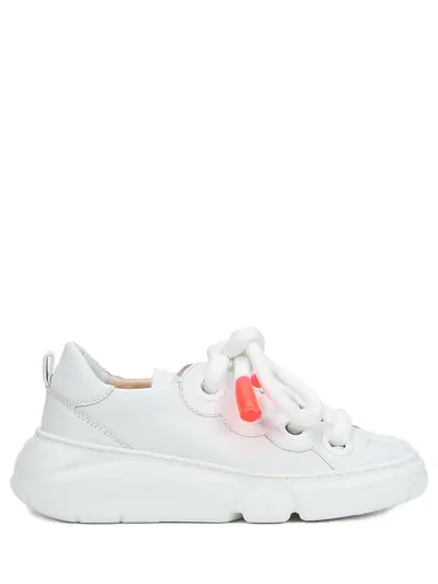 -Белые кеды из натуральной кожи от AGL. -Модель с закругленным мысом, крупными люверсами в тон, функциональной шнуровкой с акцентными деталями, литой резиновой подошвой с протектором и логотипами на пятках, внутренней отделкой из натуральной кожи.