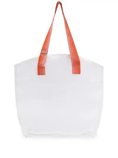 off-white/geranium orange mesh design sheer ombré effect silver-tone logo plaque two flat top handles open top main compartment