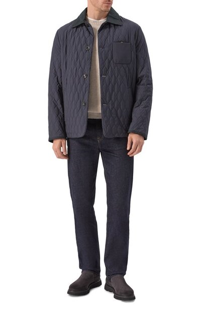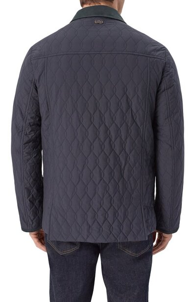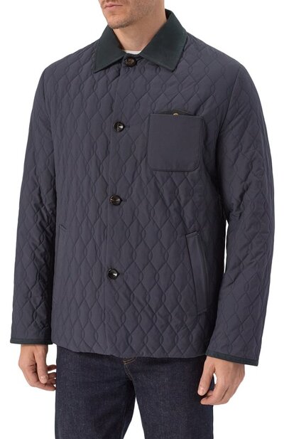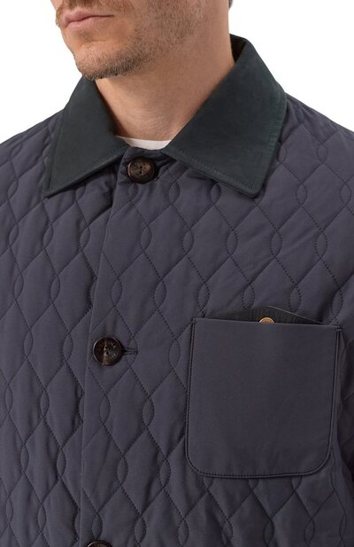 Стеганую куртку с отложным воротником и двумя шлицами сзади дополнили боковыми и нагрудным карманами. Модель из непродуваемого полиэстера застегивается брендированными пуговицами.