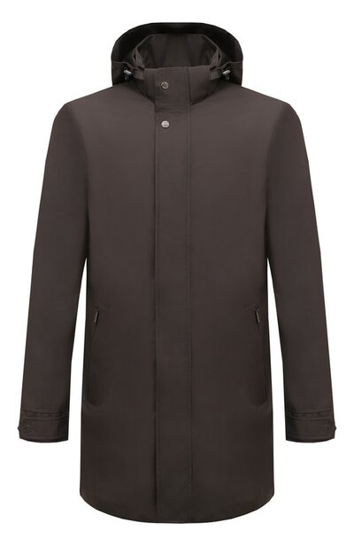 Прямую парку Petrarca-GF из линии Acqua выполнили из водоотталкивающего мембранного габардина, изготовленного из полиэстера. Изделие с регулируемыми манжетами и капюшоном, который можно отстегнуть, дополнили пятью внутренними карманами и двумя внешними.