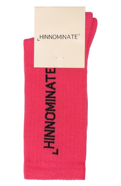 Высокие носки цвета фуксии изготовили из тонкого хлопкового трикотажа, который отлично пропускает воздух. Чтобы материал не вытягивался, в состав добавили прочные волокна нейлона и эластана. На паголенке черными нитями сформировали узор в виде логотипа бренда.