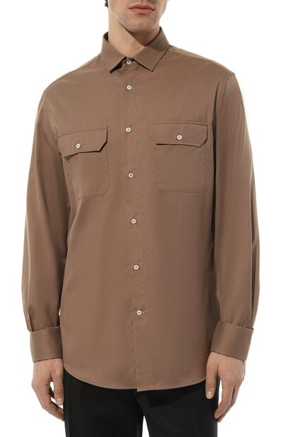 Лаконичная рубашка сможет стать основной и повседневного, и офисного образа. Модель с двумя накладными нагрудными карманами сшили из гладкой хлопковой ткани.