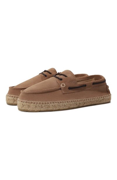 Эспадрильи оттенка кофе с молоком напоминают топсайдеры, у которых позаимствовали характерную форму верха и продетый в люверсы вдоль выреза шнурок. Для пошива модели использовали тонко выделанную бархатистую замшу, поэтому она комфортно облегает стопу. Широкую джутовую подошву дополнили аутсолью из натурального каучука, чтобы ноги не скользили на мокрых поверхностях.