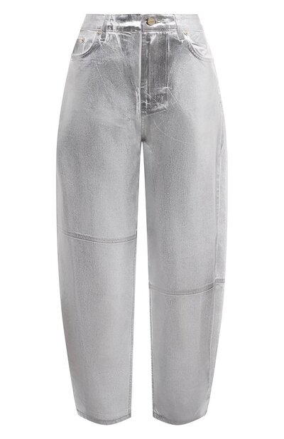 Свободные джинсы с завышенной посадкой сияют в лучах света. Такой эффект создали техникой ламинирования: на мягкую ткань из органического хлопка нанесли под воздействием высоких температур тонкий слой серебристой фольги. Асимметричный вид модели придали горизонтальные швы, расположенные на разной высоте брючин.