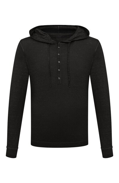 В черном удлиненном лонгсливе будет комфортно даже жарким летним днем. Для изготовления модели с капюшоном использовали тончайший льняной трикотаж, который обладает антибактериальными и терморегулирующими свойствами. Глубина выреза регулируется пуговицами на короткой планке, как у хенли.